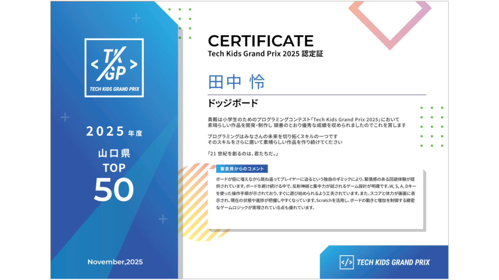 そしてなんと今回、「Tech Kids Grand Prix 2025」で、田中 怜さんが地域で高く評価され、特別に “認定証” が贈呈されました!